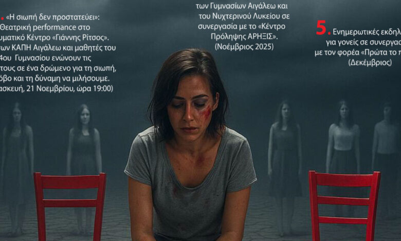 Ο Δήμος Αιγάλεω, με σταθερή δέσμευση απέναντι στην πρόληψη και αντιμετώπιση κάθε μορφής βίας, συνεχίζει τις δράσεις ενημέρωσης για την έμφυλη βία, μέσα από το κεντρικό μήνυμα «Η Σιωπή Δεν Προστατεύει».